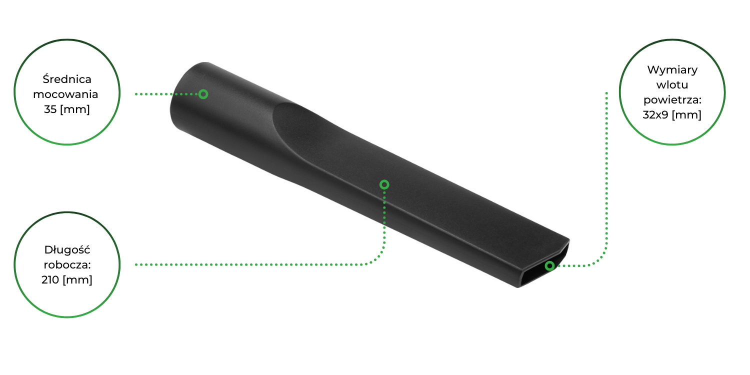 Ssawka została wyprodukowana z solidnego materiału, a przy okazji jest bardzo lekka i wytrzymała. Sprzyja sprzątaniu kurzu i świetnie sprawdza się w usuwaniu wszelkiego rodzaju płynów. Dzięki bardzo wąskiej końcówce szczotki, odkurzacz nie traci na swojej mocy ssania. Ssawka szczelinowa jest doskonałym produktem do użytku domowego oraz przemysłowego.