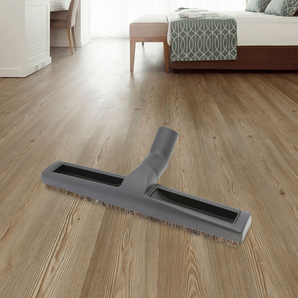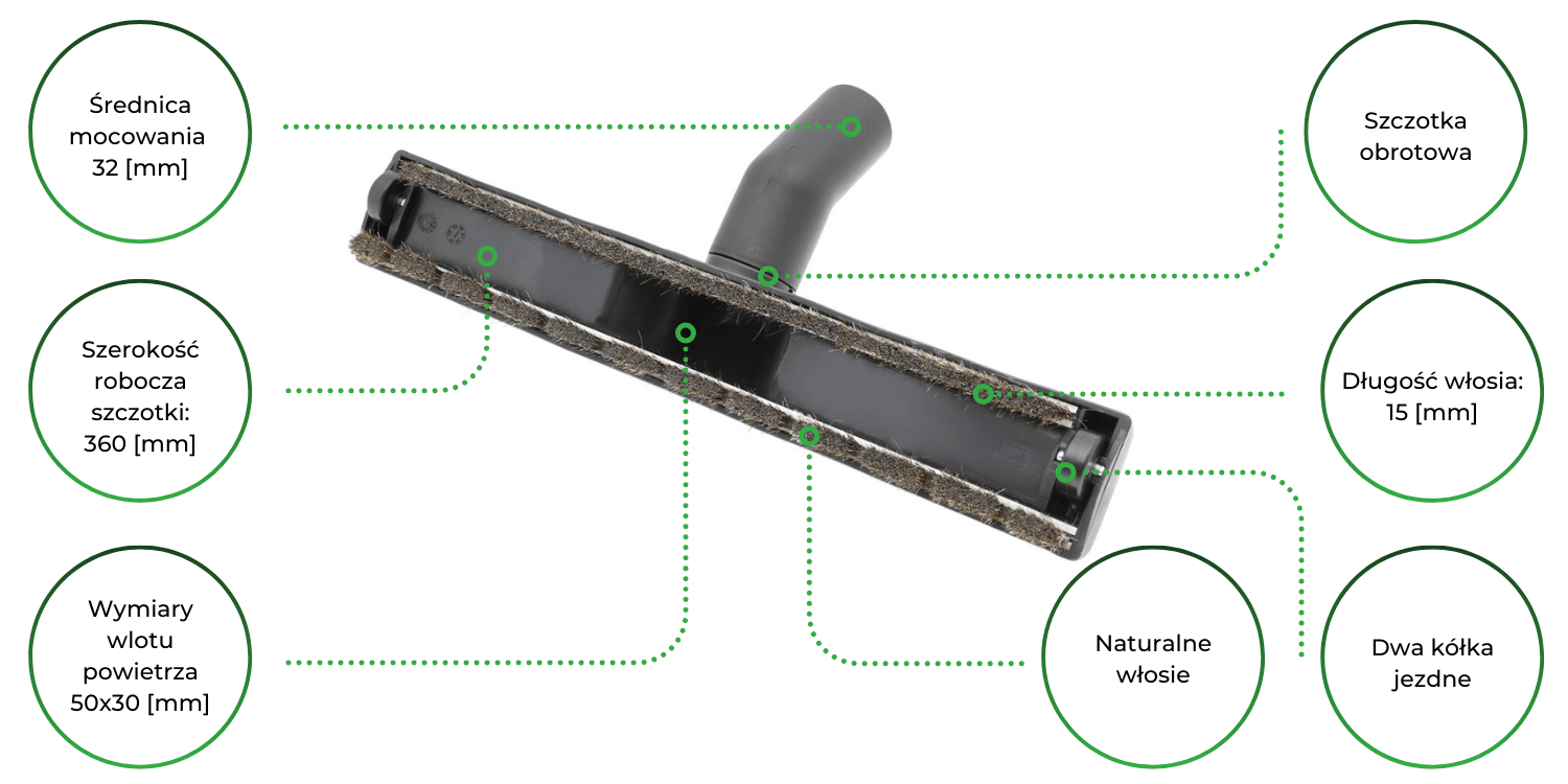 Szczotka z naturalnym włosiem przesuwa się miękko i delikatnie po podłodze. Szeroka konstrukcja szczotki oraz zastosowanie przednich i tylnych listew zdecydowanie ułatwiają skuteczne zbieranie kurzu. Obrotowy przegub i kółka dodają szczotce zwinności przez co zwiększa się wygoda podczas użytkowania. Szczotka znajduje zastosowanie w czyszczeniu podłóg wyłącznie na sucho.