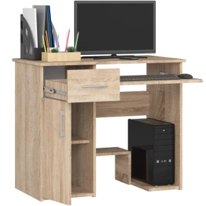 Dąb sonoma to kolor, który nie bez powodu dominuje w nowoczesnych wnętrzach: jest jasny, optycznie powiększa przestrzeń i wprowadza do pomieszczenia naturalny spokój. Ergonomię mebla podkreślają metalowe prowadnice kulkowe, na których porusza się szuflada oraz półka pod klawiaturę, zapewniając płynną i cichą pracę. Lewa strona mebla kryje pojemną szafkę z wewnętrzną półką, natomiast prawa strona oferuje otwartą przestrzeń na jednostkę PC, co pozwala na optymalne zorganizowanie okablowania i sprzętu.