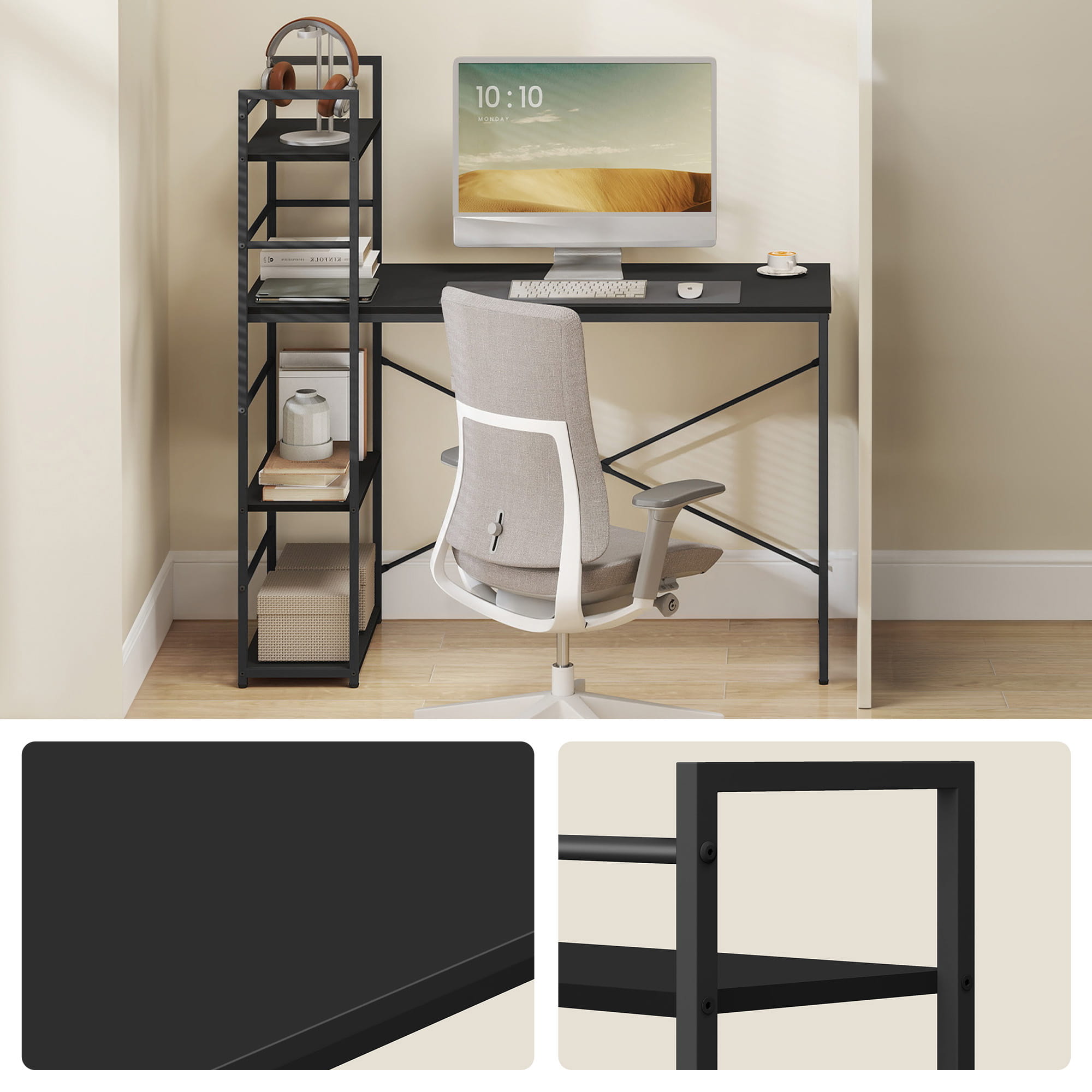 Stylowy i funkcjonalny zestaw mebli idealny do domowego biura, pokoju młodzieżowego, gabinetu lub kącika do nauki. Nowoczesne czarne biurko komputerowe z praktycznymi półkami oraz ergonomiczne krzesło skandynawskie Livio w żółtym kolorze łączą wygodę, solidność i modny design.