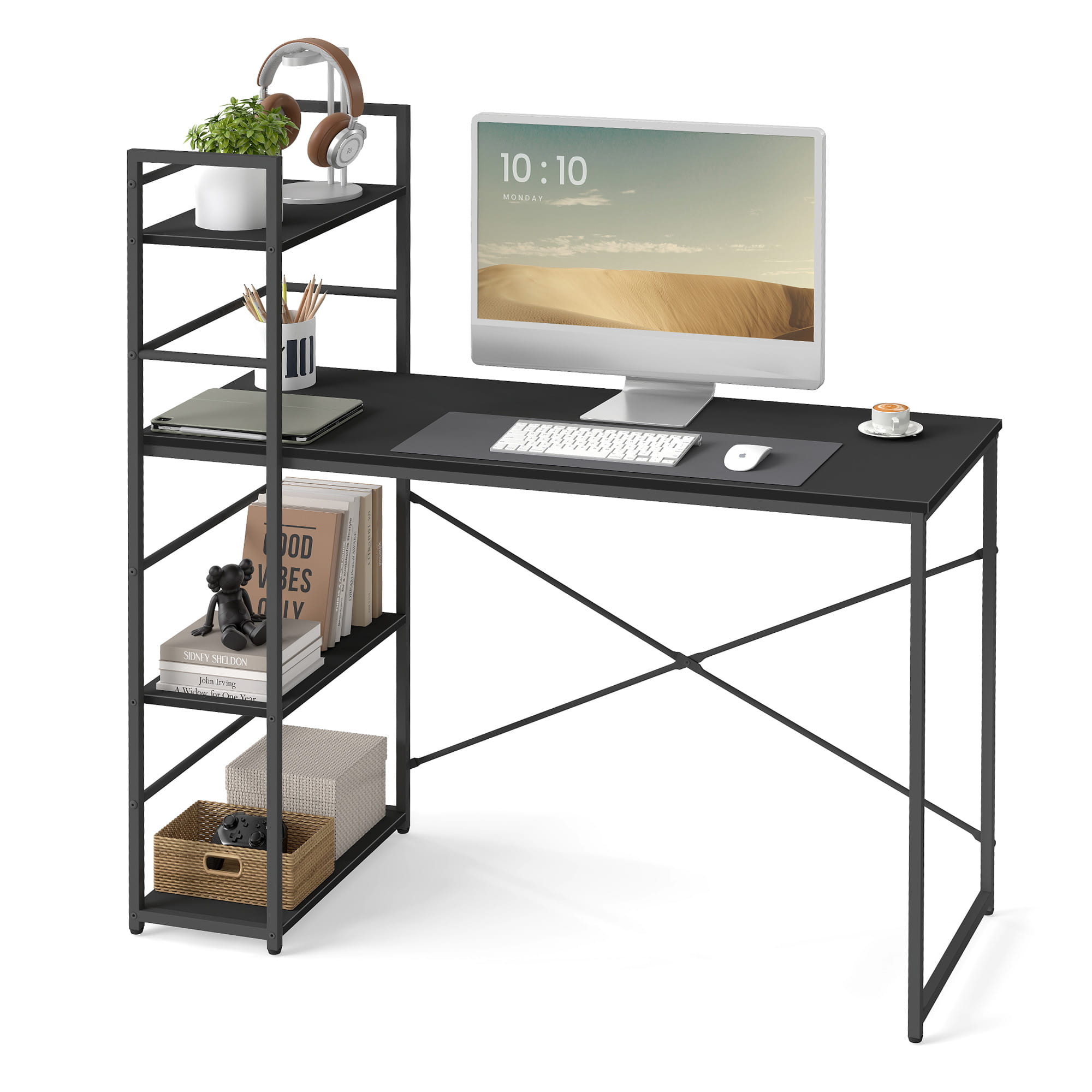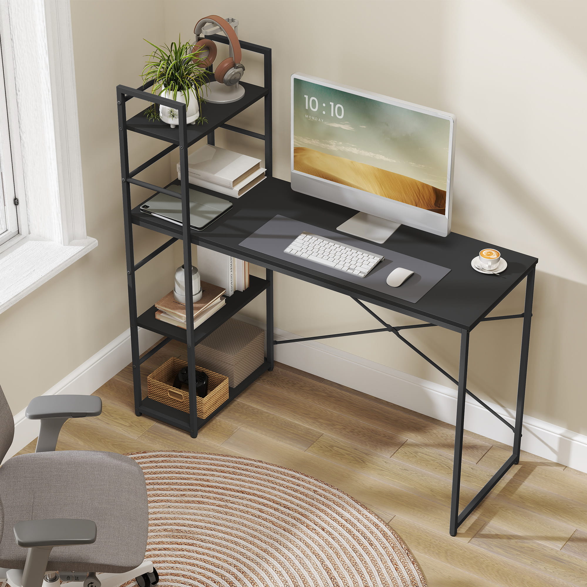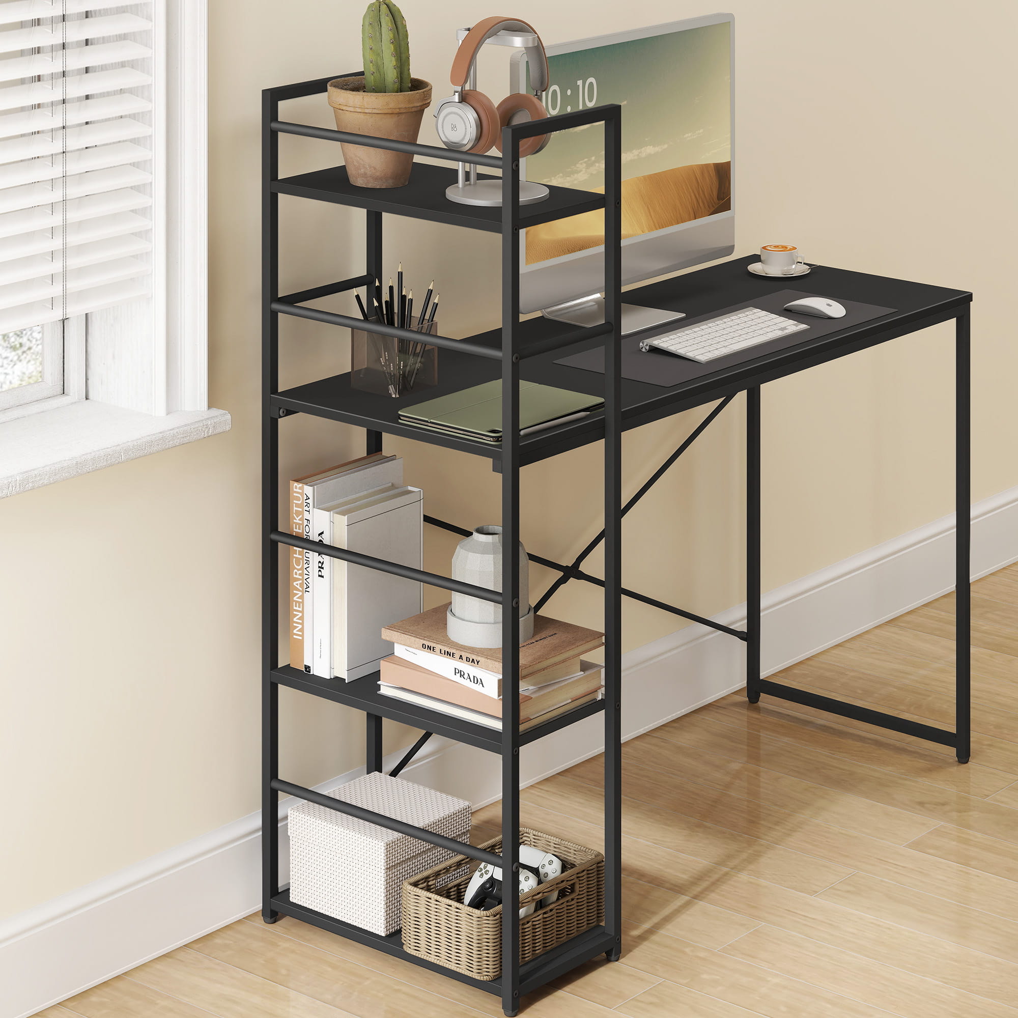 Biurko zapewnia wystarczająco dużo miejsca na komputer, monitor, drukarkę, książki i akcesoria. Trzy praktyczne półki pomieszczą dokumenty, dekoracje lub rośliny, a stalowa rama gwarantuje stabilność i trwałość.