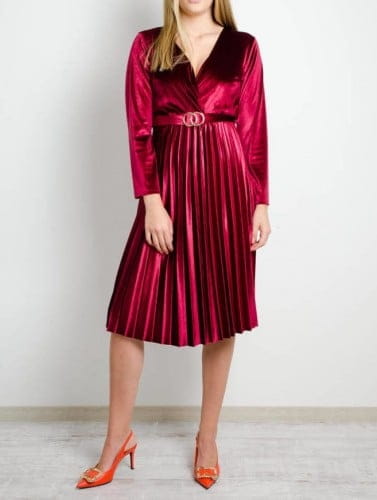 Model o klasycznym kroju, doskonale podkreśla kobiecą sylwetkę, jednocześnie oferując komfort noszenia. Welurowa struktura tkaniny nadaje ubraniu subtelny połysk, tworząc efektowny kontrast z głębokim odcieniem czerwieni. Plisowanie, elegancko rozmieszczone na całej długości sukienki, dodaje jej lekkości i sprawia, że każdy ruch jest wyjątkowy.