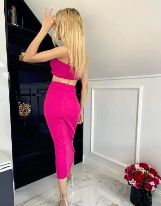 Letni komplet składający się z topu i spódnicy w intensywnym kolorze fuksji z prążkami to manifestacja energii, świeżości i wyrazistości. Ten zestaw emanuje letnim optymizmem, podkreślając jednocześnie indywidualność i pewność siebie noszącej go kobiety.