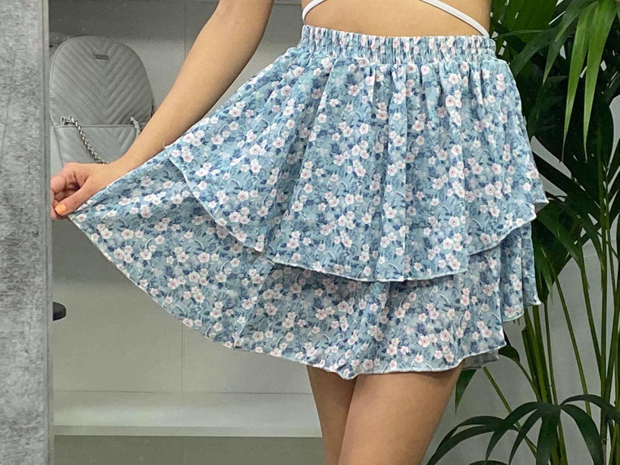 Niebieski kolor spódniczki nawiązuje do błękitnego nieba letniego dnia, dodając jej radosnego i przyjemnego wyrazu. Białe kwiaty, zdobiące całą spódniczkę, tworzą romantyczny wzór, który wprowadza do stylizacji nutę delikatności.