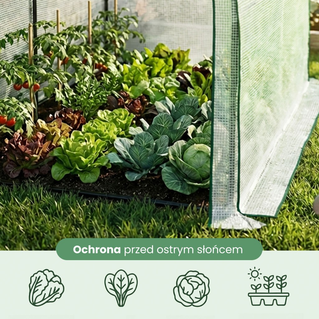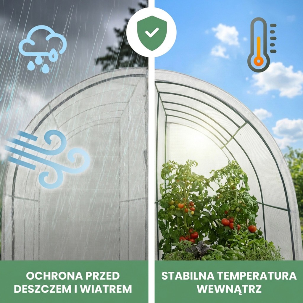 Zastosowanie folii PE z wtopioną siatką wzmacniającą gwarantuje wysoką odporność na uszkodzenia mechaniczne i zmienne warunki pogodowe. Stalowy stelaż malowany proszkowo (średnica rur 16 mm) tworzy sztywny szkielet, a dołączone do zestawu kotwy gruntowe pozwalają na pewne osadzenie konstrukcji w podłożu.