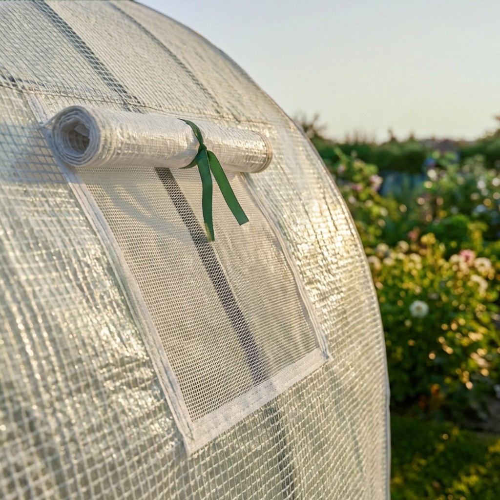 Dla optymalnej cyrkulacji powietrza szklarnia została wyposażona w jedno okno z moskitierą oraz szerokie, rolowane drzwi zamykane na trwałe zamki błyskawiczne. Biały kolor poszycia skutecznie rozprasza światło słoneczne, chroniąc delikatne liście przed poparzeniami, przy jednoczesnym zachowaniu wysokiej przepuszczalności energii niezbędnej do wzrostu.