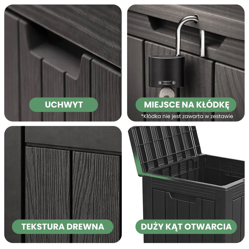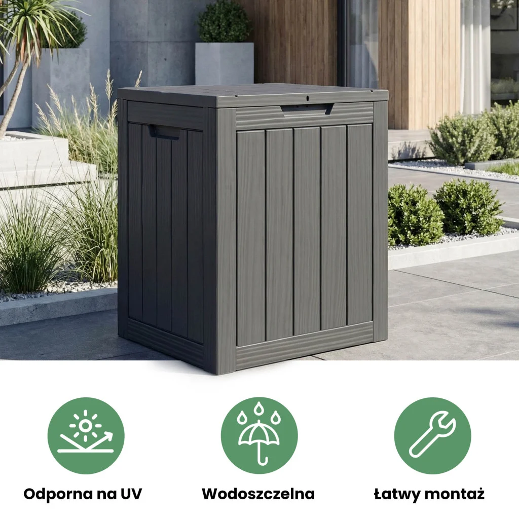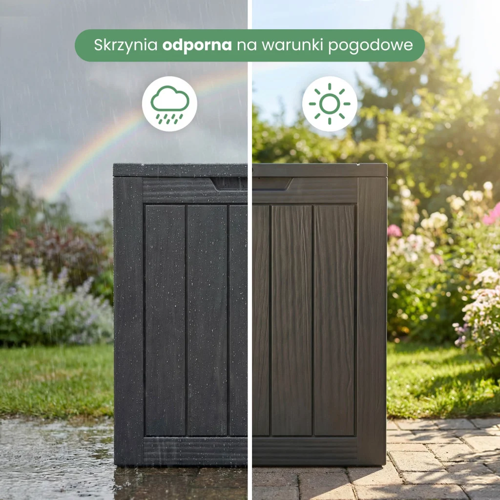 Konstrukcja wykonana z wysokiej jakości polipropylenu charakteryzuje się całkowitą odpornością na zmienne warunki atmosferyczne. Dzięki zastosowaniu filtra UV, czarny kolor nie blaknie na słońcu, a wodoszczelna struktura materiału gwarantuje, że zawartość pozostanie sucha nawet podczas intensywnych opadów. Skrzynia jest wyjątkowo lekka (tylko 3,5 kg), co pozwala na jej swobodne przestawianie, a jednocześnie na tyle solidna, by służyć przez wiele sezonów. Montaż typu "click" jest błyskawiczny i nie wymaga użycia specjalistycznych narzędzi.