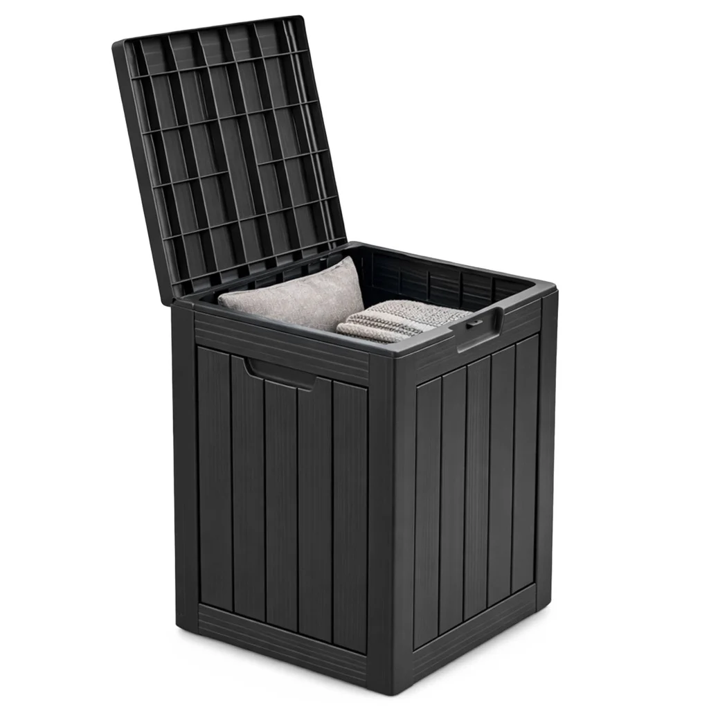 Nowoczesny minimalizm: Głęboka czerń i prosta forma sprawiają, że skrzynia dyskretnie wpisuje się w każdą aranżację – od nowoczesnych mebli technorattanowych po klasyczne drewno.