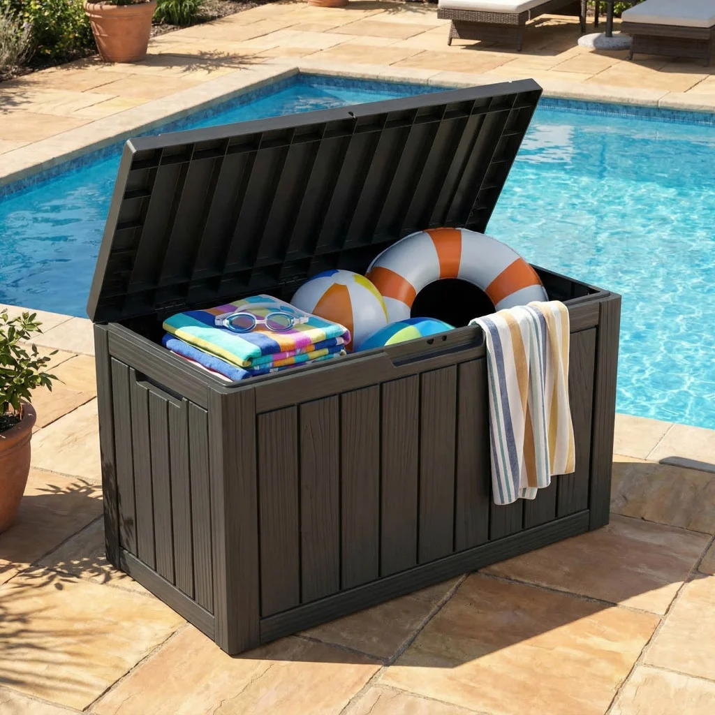 Pojemna skrzynia ogrodowa 170L w kolorze czarnym to idealne połączenie trwałości i estetyki. Dzięki szerokości wynoszącej blisko 78 cm, bez trudu pomieści większe poduszki ogrodowe, narzędzia czy akcesoria basenowe. Wykonana z odpornego na wodę i promieniowanie UV polipropylenu, stanowi niezawodną ochronę dla Twoich rzeczy przez cały rok.