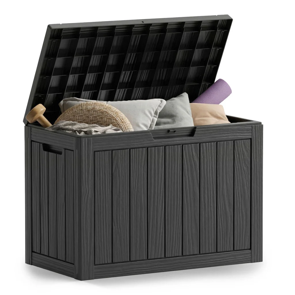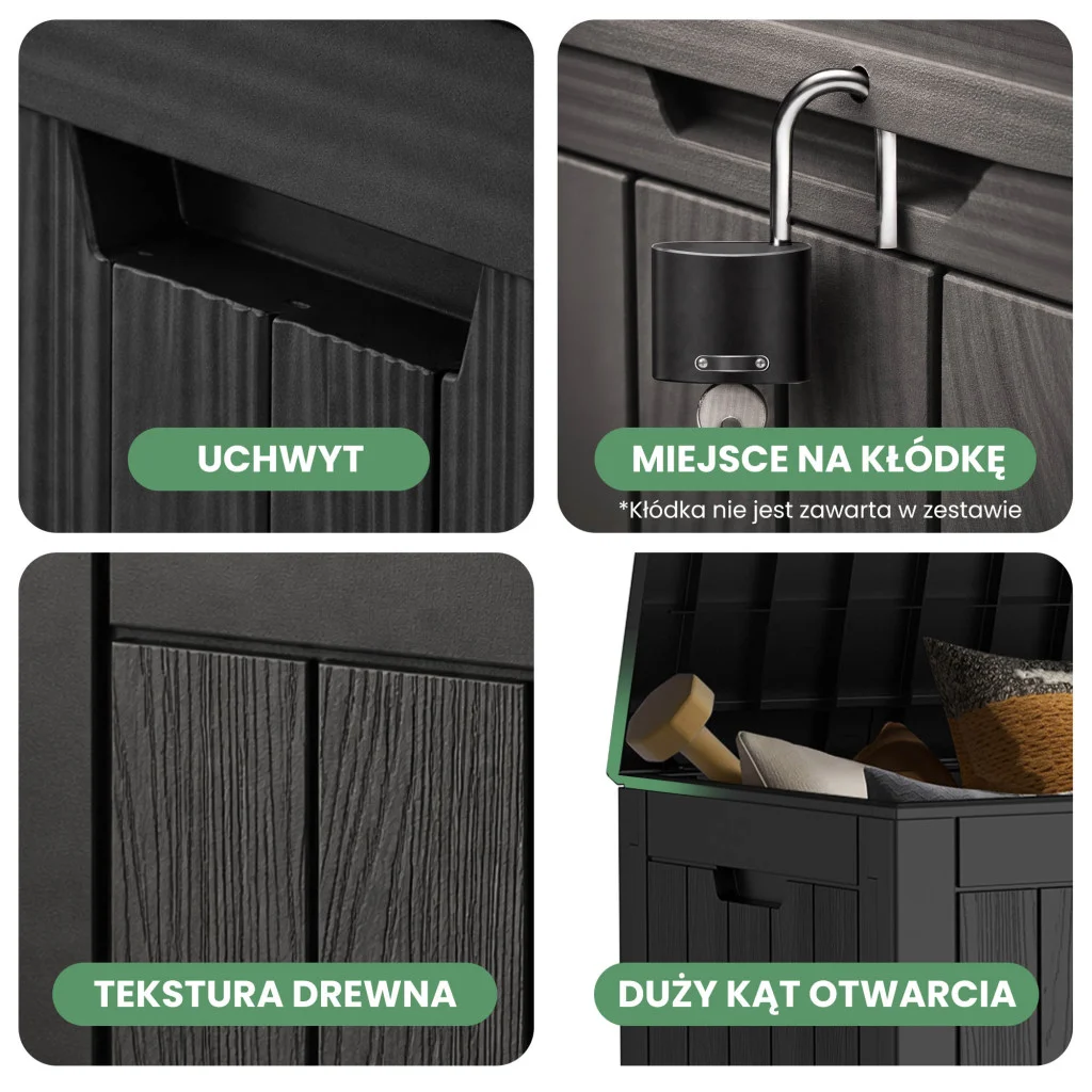 Maksymalna pojemność: 170 litrów pozwala na schowanie kompletnego zestawu poduszek z narożnika ogrodowego lub dużej ilości zabawek dziecięcych.