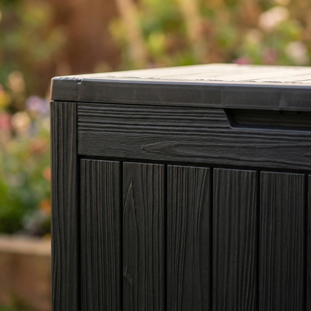 Łatwość pielęgnacji: Skrzynia nie wymaga malowania ani konserwacji – do czyszczenia wystarczy woda z węża ogrodowego lub wilgotna szmatka.