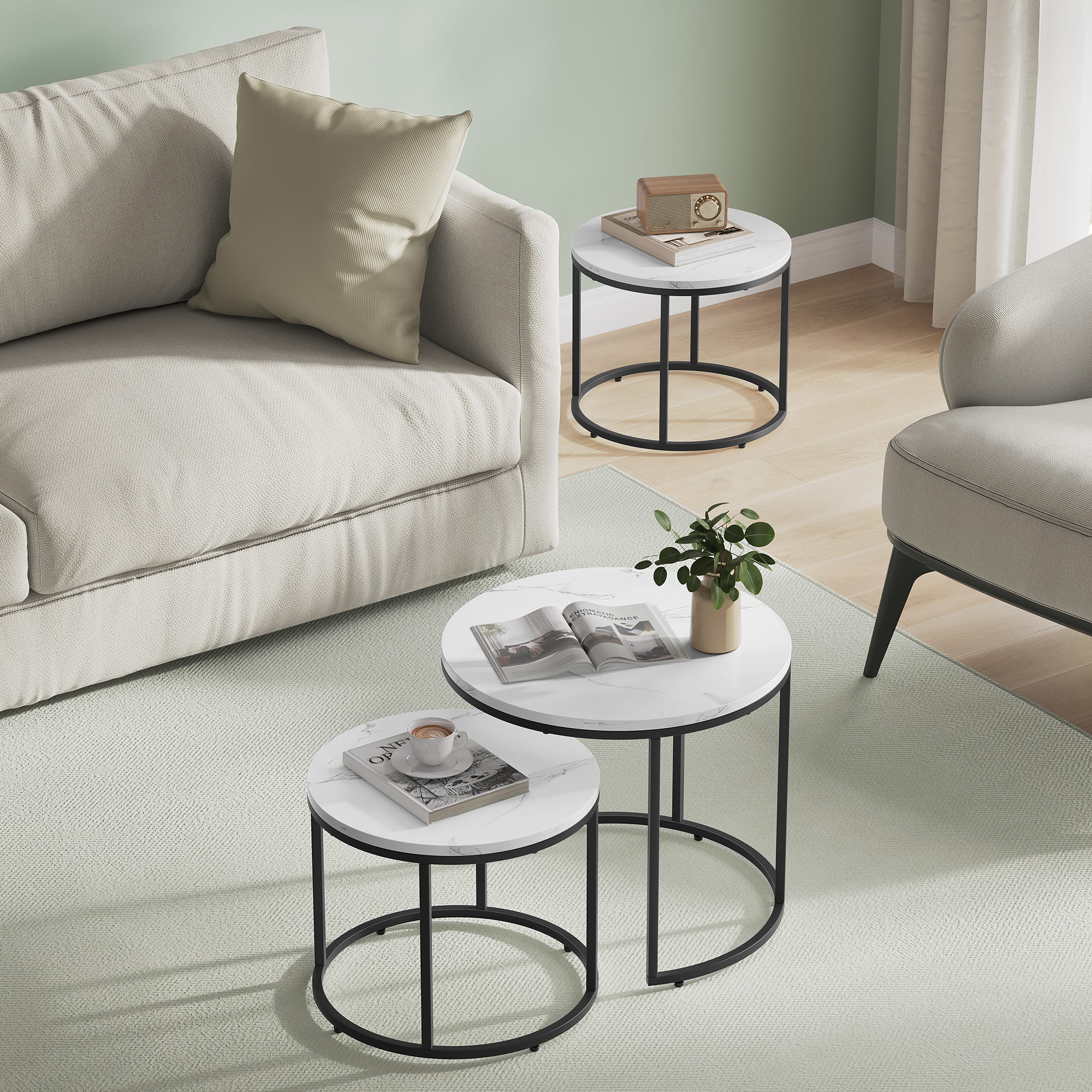 Stolik kawowy okrągły 2szt - marmur / nogi czarne