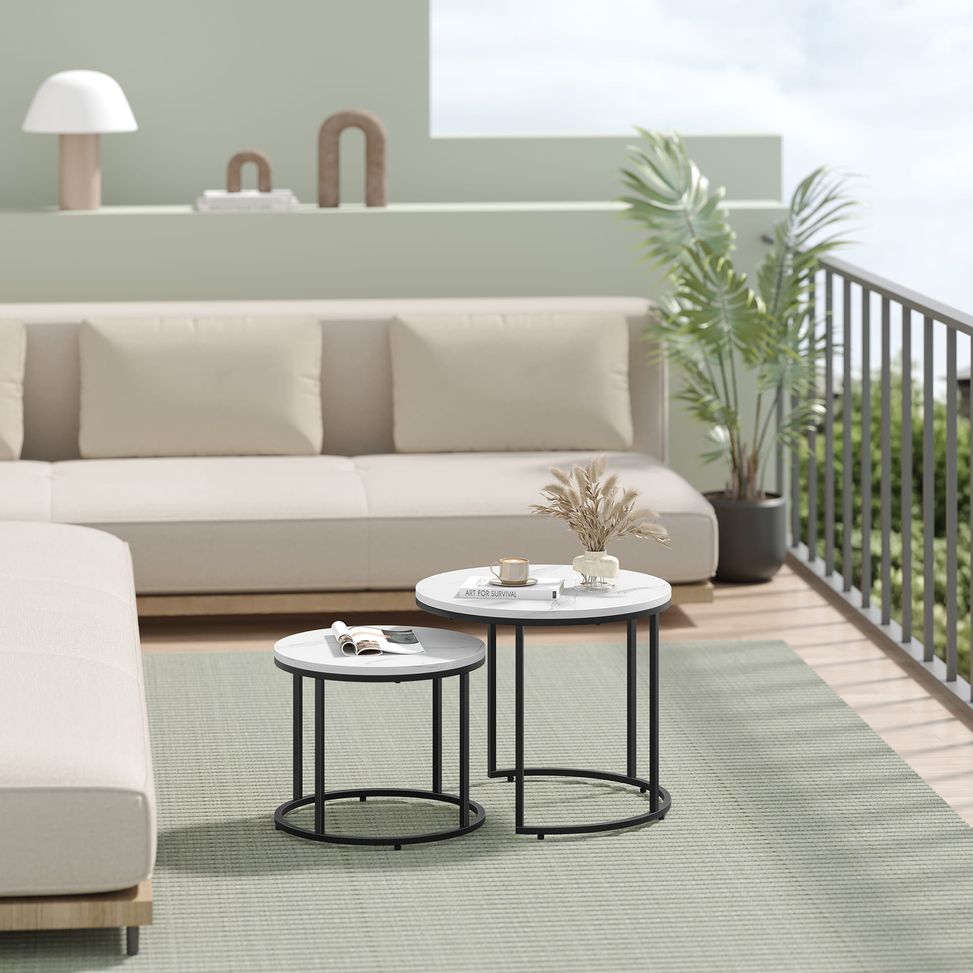- Wymiary mniejszego stolika: 43 x 35 cm (średnica x wysokość)