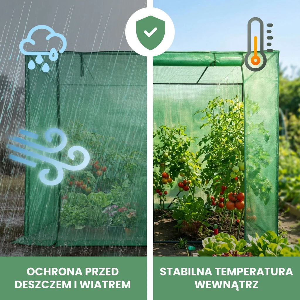 Dzięki zastosowaniu wytrzymałej folii PE z siatką wzmacniającą i filtrem UV, rośliny są chronione przed nadmiernym nasłonecznieniem, deszczem oraz wiatrem, jednocześnie mając zapewniony dostęp do odpowiedniej ilości światła.