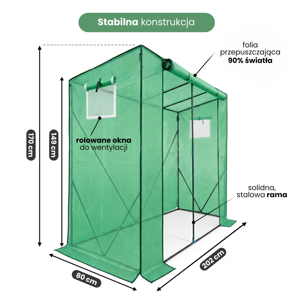 Stabilny stelaż wykonany ze stali malowanej proszkowo gwarantuje trwałość konstrukcji, a kompaktowy rozmiar sprawia, że szklarnia świetnie sprawdzi się zarówno w ogrodzie, jak i na działce.