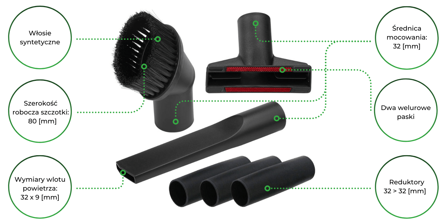 Przeznaczone do odkurzaczy Zelmer z rurkami teleskopowymi, których wewnętrzna średnica wynosi 32 [mm].