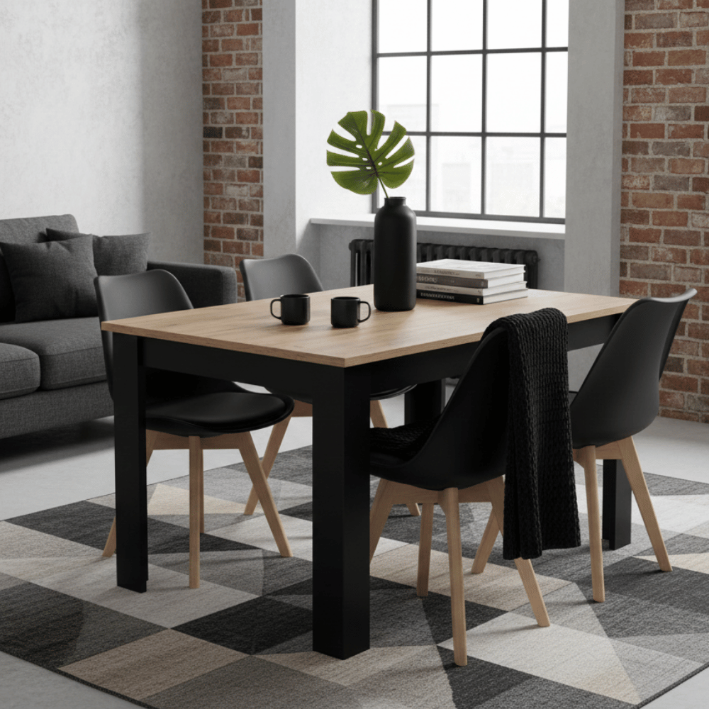 To więcej niż stół – to manifest stylu! Prostokątny blat w kolorze Craft (okleina PVC) na masywnych, czarnych nogach to kluczowa fraza dla każdego, kto szuka stół industrialny 4 osobowy. Jest to idealny, funkcjonalny rozmiar stołu do średniej wielkości kuchni lub jadalni.