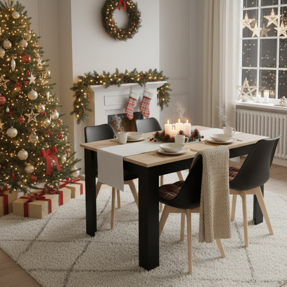Postaw na połączenie ciepła drewna i minimalistycznej czerni! Dodaj zestaw do koszyka i ciesz się stylową jadalnią.